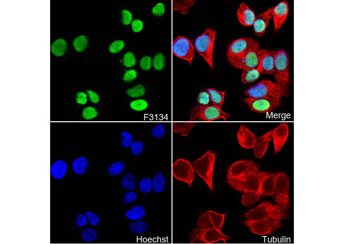 • Immunofluorescent analysis of MCF-7 cells using F3134 (green, 1:50), Hoechst (blue) and tubulin (Red).