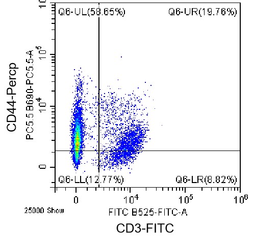 • Staining of C57BL/6 mouse splenic lymphocytes using FITC CD3 Antibody and PerCP CD44 Antibody (Clone: IM7) (Catalog Number: G0086). Analysis data derived from total live cells.