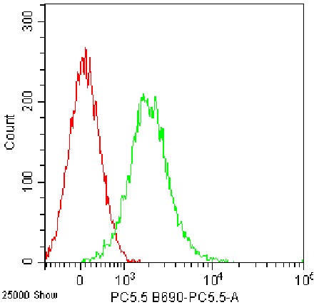 • Staining of C57BL/6 mouse splenic lymphocytes (green) using PerCP CD45.2 Antibody (Clone: 104) (Catalog Number: G0311) and blank control (red). Analysis data derived from total live cells.
