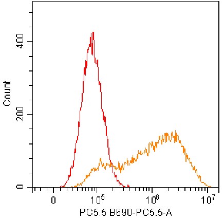 • Staining of fixed/permeabilized HEK-293F cell line cells transfected with pLV3-CMV-ABCG2(human)-3×FLAG-Puro plasmid (orange) using PerCP-Cy5.5 BCRP1 Antibody (Clone: 5D3) (Catalog Number: H2990) and blank control (red). Analysis data derived from total cells.