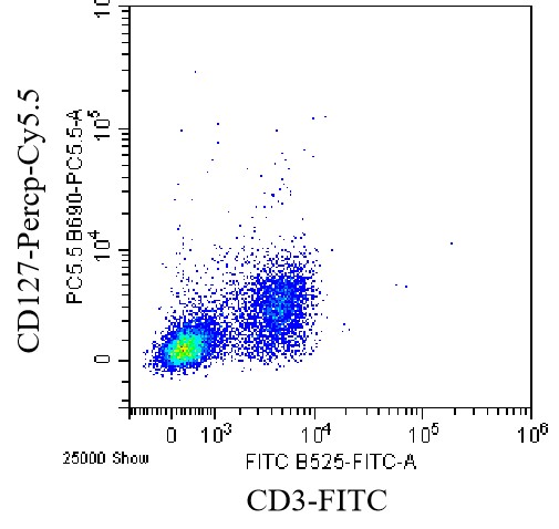 • Staining of splenic lymphocytes from C57BL/6 mice using FITC Anti-CD3 Antibody and PerCP-Cy5.5 Anti-CD127 Antibody (Clone: A7R34) (Product No.: G0455). Analyzed data are derived from live lymphocytes.