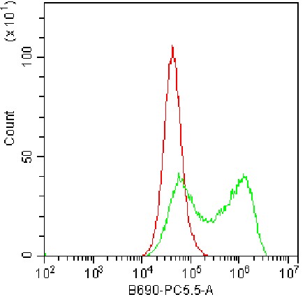 • Staining of permeabilized HEK-293F cells transfected with Mouse ICOS cDNA ORF Clone, C-DYKDDDDK tag plasmid using fixation/permeabilization buffer with PerCP-Cy5.5 anti-mouse CD278 Antibody (Clone: C398.4A) (Selleck Cat.No: G1100) (green, red is unstained control). Analysis data derived from total cells.