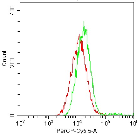 • Staining of bEnd-3 cell line with PerCP-Cy5.5 anti-mouse CD309/FLK1 Antibody (Clone: Avas12a1) (Selleck Cat.No: G0560) (green, red is unstained control). Analysis data derived from total live cells.