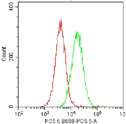 • Staining of F9 cell line cells (green) using PerCP-Cy5.5 CD324/E-Cadherin Antibody (Clone: DECMA-1) (Catalog Number: H3605) and blank control (red). Analysis data derived from total cells.