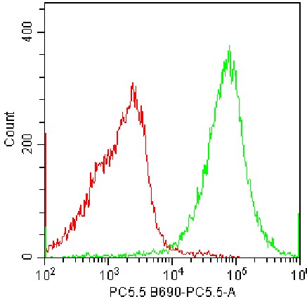 • Staining of fixed/permeabilized Jurkat cells using PerCP-Cy5.5 CXCR4 Antibody (Clone: UMB2) (Product No.: G4925) (Green, Red: Blank Control). Analyzed data are derived from total live cells.