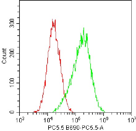 • Staining of J774A.1 cell line cells using PerCP-Cy5.5 F4/80 Antibody (Clone: BM8) (Product No.: G0065) (Green, Red: Blank Control). Analyzed data are derived from total live cells.