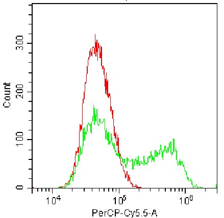 • Staining of permeabilized HEK-293F cells transfected with pCMV-VTCN1(human)-3×Myc-Puro plasmid using fixation/permeabilization buffer with PerCP-Cy5.5 anti-human B7-H4 Antibody (Clone: MIH43) (Product Code: H2765) (green, red is unstained control). Analysis data derived from total cells.