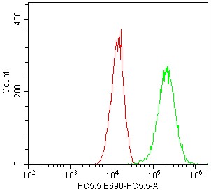 • Staining of Hela cell line cells using PerCP-Cy5.5 Anti-Human CD146 Antibody (Clone: P1H12) (Product No.: H1040) (green, red is blank control). Analyzed data are derived from live cells.