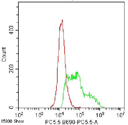 • Staining of fixed/permeabilized HEK-293F cells transfected with pEnCMV-CTLA4(human)-1-3×FLAG-SV40-Neo plasmid using PerCP-Cy5.5 Anti-Human CD152/CTLA-4 Antibody (Clone: BNI3) (Product No.: H1355) (green, red is blank control). Analyzed data are derived from total cells.