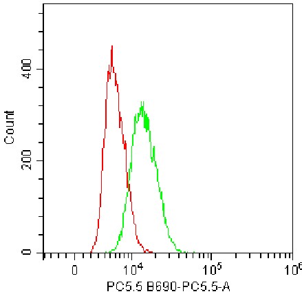 • Staining of U937 cell line cells using PerCP-Cy5.5 Human CD155/PVR Antibody (Clone: SKII.4) (Product No.: H1370) (Green, Red: Blank Control). Analyzed data are derived from total live cells.