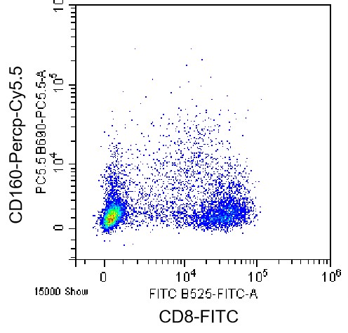 • Staining of normal human peripheral blood mononuclear cells (PBMCs) using FITC Anti-CD8a Antibody and PerCP-Cy5.5 Anti-Human CD160 Antibody (Clone: BY55) (Product No.: H2135). Analyzed data are derived from lymphocytes.