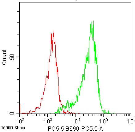 • Staining of normal human peripheral blood mononuclear cells (PBMCs) using PerCP-Cy5.5 Anti-Human CD166/ALCAM Antibody (Clone: 3A6) (Product No.: H2825) (Green, red is blank control). Analyzed data are derived from monocytes.