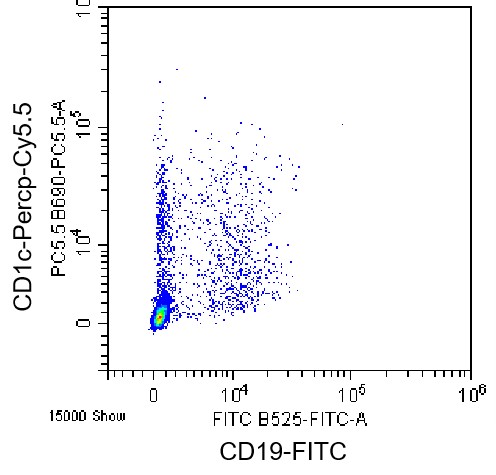 • Staining of normal human peripheral blood mononuclear cells (PBMCs) using FITC Anti-CD19 Antibody and PerCP-Cy5.5 Anti-Human CD1c Antibody (Clone: L161) (Product No.: H1595). Analyzed data are derived from lymphocytes.