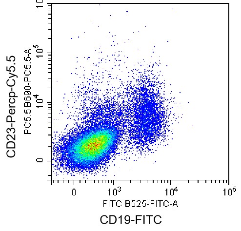 • Staining of normal human peripheral blood mononuclear cells (PBMCs) using FITC CD19 Antibody and PerCP-Cy5.5 Human CD23 Antibody (Clone: M-L233) (Catalog Number: H0875). Analysis data derived from lymphocytes.