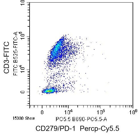 • Staining of normal human peripheral blood mononuclear cells (PBMCs) using FITC Anti-CD3 Antibody and PerCP-Cy5.5 Anti-Human CD279/PD-1 Antibody (Clone: EH12.2H7) (Product No.: H0440). Analyzed data are derived from lymphocytes.