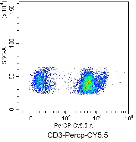 • Staining of normal human peripheral blood mononuclear cells (PBMCs) with PerCP-Cy5.5 anti-human CD3 Antibody (Clone: UCHT1) (Product Code: H4355). Analysis data derived from lymphocytes.