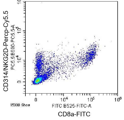 • Staining of normal human peripheral blood mononuclear cells (PBMCs) using FITC Anti-CD8a Antibody and PerCP-Cy5.5 Anti-Human CD314/NKG2D Antibody (Clone: 1D11) (Product No.: H1400). Analyzed data are derived from lymphocytes.