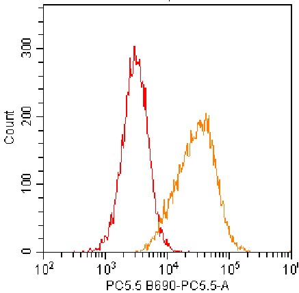 • Staining of KG1a cell line cells using PerCP-Cy5.5 Human CD325/N-Cadherin Antibody (Clone: 8C11) (Product No.: H3200) (Orange, Red: Blank Control). Analyzed data are derived from total live cells.