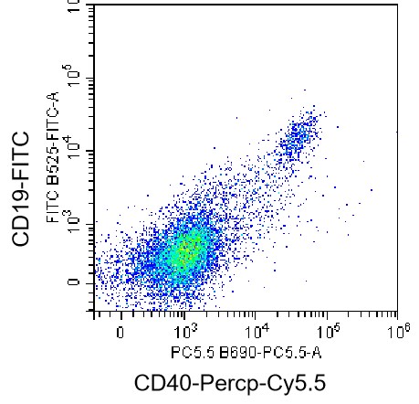 • Staining of normal human peripheral blood mononuclear cells (PBMCs) using FITC Anti-CD19 Antibody and PerCP-Cy5.5 Anti-Human CD40 Antibody (Clone: 5C3) (Product No.: H0560). Analyzed data are derived from lymphocytes.