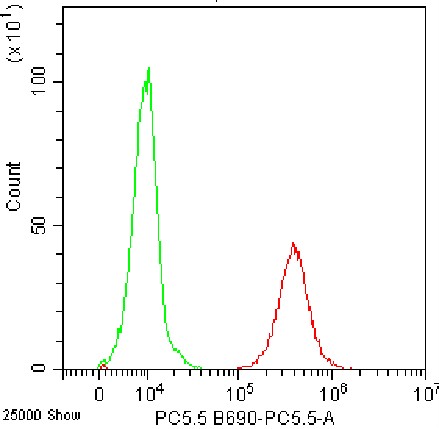 • Staining of normal human peripheral blood mononuclear cells (PBMCs) using PerCP-Cy5.5 Anti-Human CD45 Antibody (Clone: HI30) (Product No.: H0095) (red, green is unstained control). Analyzed data are derived from lymphocytes.