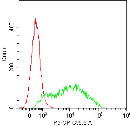 • Staining of normal human peripheral blood mononuclear cells (PBMCs) with PerCP-Cy5.5 anti-human CD82 Antibody (Clone: ASL-24) (Product Code: H3875) (green, red is unstained control). Analysis data derived from lymphocytes.