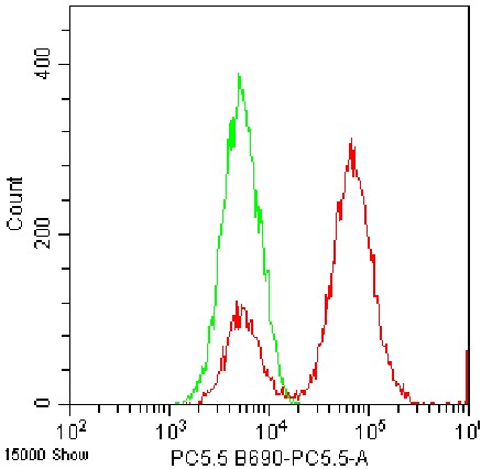 • Staining of Jurkat cell line cells using PerCP-Cy5.5 Anti-Human CD90 Antibody (Clone: 5E10) (Product No.: H0305) (red, green is unstained control). Analyzed data are derived from live cells.