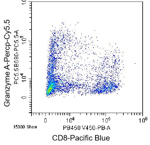 • Surface staining of normal human peripheral blood mononuclear cells (PBMCs) using PB CD8a Antibody, followed by permeabilization with fixation/permeabilization reagent, then intracellular staining using PerCP-Cy5.5 Human Granzyme A Antibody (Clone: CB9) (Catalog Number: H2075). Analysis data derived from cells in the lymphocyte gate.