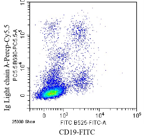 • Staining of normal human peripheral blood mononuclear cells (PBMCs) using PerCP-Cy5.5 Human Ig light chain λ Antibody (Clone: MHL-38) (Selleck Cat#: H3680) and FITC CD19 Antibody. Analyzed data are derived from lymphocytes.
