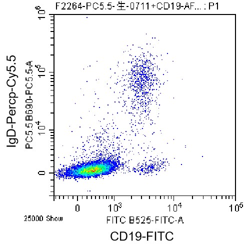 • Staining of normal human peripheral blood mononuclear cells (PBMCs) using FITC CD19 Antibody and PerCP-Cy5.5 Human IgD Antibody (Clone: IA6-2) (Catalog Number: H3695). Analysis data derived from lymphocytes.