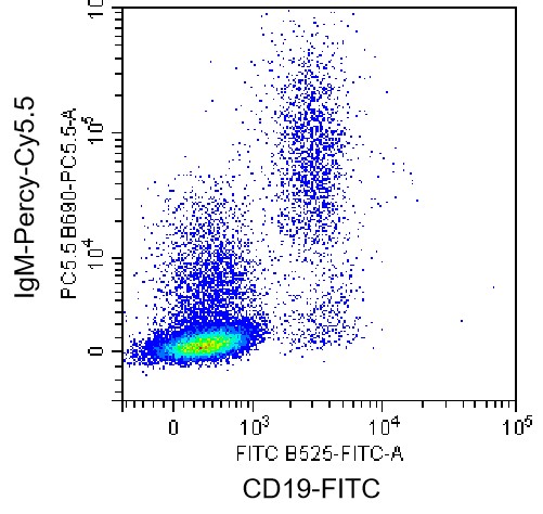 • Staining of normal human peripheral blood mononuclear cells (PBMCs) blocked with Human Fc Block using FITC CD19 Antibody and PerCP-Cy5.5 Human IgM Antibody (Clone: MHM-88) (Catalog Number: H1010). Analysis data derived from lymphocytes.