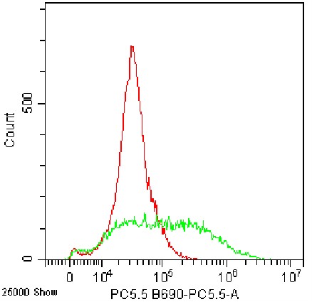 • Staining of fixed/permeabilized HEK-293F cell line cells transfected with pCMV-CD274(human)-3×FLAG-Neo plasmid (green) using PerCP-Cy5.5 Human PD-L1 Antibody (Clone: 29E.2A3) (Catalog Number: H4295) and blank cells (red). Analysis data derived from total cells.