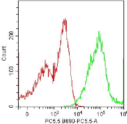 • Staining of NCCIT cell line cells using PerCP-Cy5.5 Anti-human SSEA-4 Antibody (Clone: MC813) (Product No.: H4400) (Green, Red: Blank Control). Analyzed data are derived from total cells.