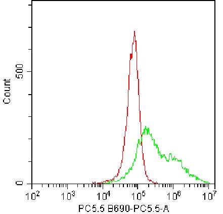 • Staining of fixed/permeabilized HEK-293F cells transfected with human IL-6 plasmid using PerCP-Cy5.5 IL-6 Antibody (Clone: MQ2-13A5) (Selleck CatNo.: G1925) (Green, Red: Blank Control). Analyzed data are derived from total cells.