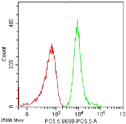 • Staining of fixed/permeabilized C57BL/6 mouse splenic lymphocytes (green) using PerCP-Cy5.5 Mouse CD107a Antibody (Clone: 1D4B) (Catalog Number: G0440) and blank control (red). Analysis data derived from lymphocytes.