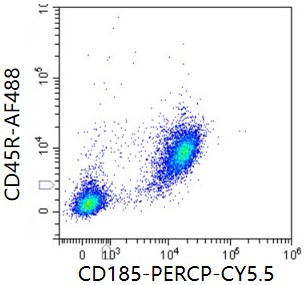 • Staining of splenic lymphocytes from C57BL/6 mice using AF488 Anti-CD45R Antibody and PerCP-Cy5.5 Anti-Mouse CD185 Antibody (Clone: 2G8) (Product No.: G1085). Analyzed data are derived from live lymphocytes.