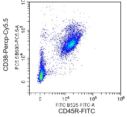 • Staining of C57BL/6 mouse splenic lymphocytes using FITC CD45R Antibody and PerCP-Cy5.5 Mouse CD38 Antibody (Clone: 90) (Catalog Number: G0845). Analysis data derived from live lymphocytes.