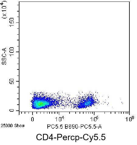 • Staining of splenic lymphocytes from C57BL/6 mice using PerCP-Cy5.5 Anti-Mouse CD4 Antibody (Clone: GK1.5) (Product No.: G4145). Analyzed data are derived from live lymphocytes.