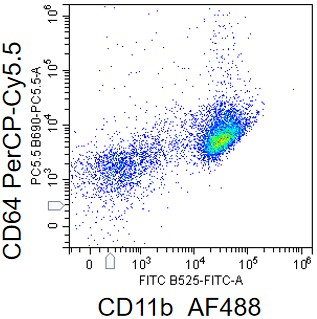 • Staining of bone marrow cells from C57BL/6 mice using AF488 CD11b Antibody and PerCP-Cy5.5 Mouse CD64 Antibody (Clone: X54-5/7.1) (Product No.: G2945). Analyzed data are derived from live cells.