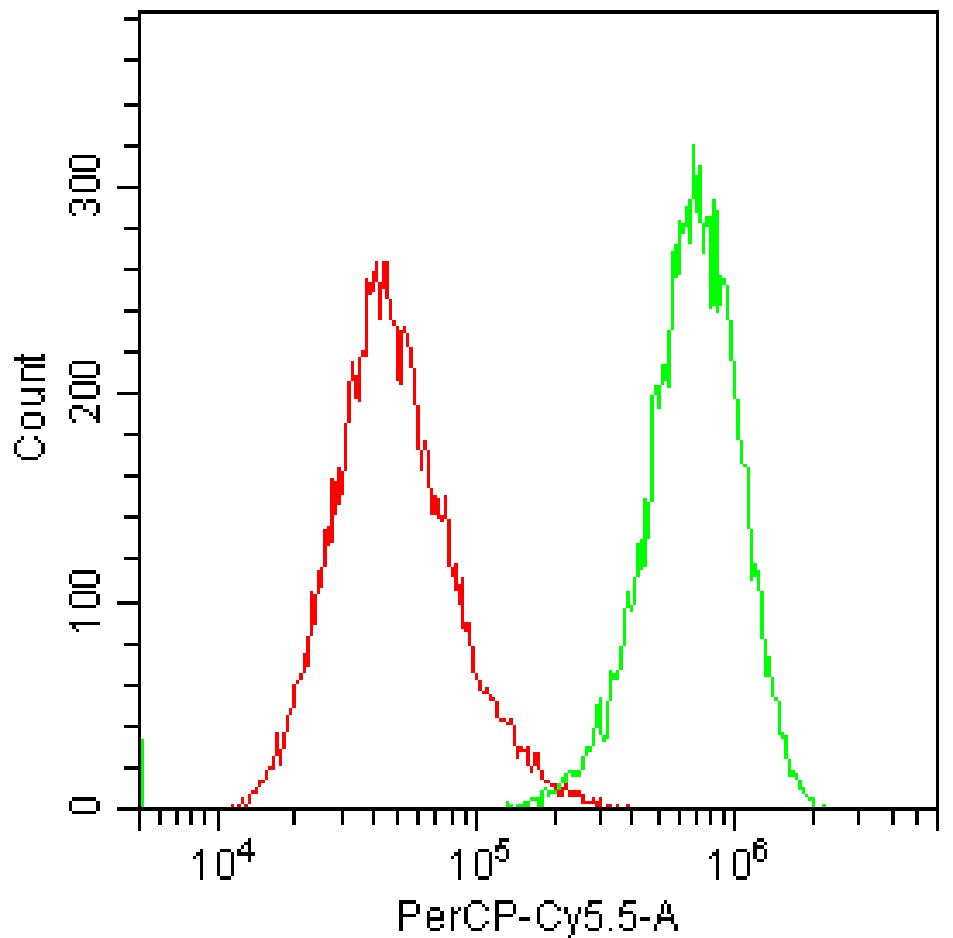 • Staining detecting intracellular κ light chain in hybridoma cell line with PerCP-Cy5.5 Mouse Ig light chain κ Antibody (Clone: 187.1) (Product Number: G3110) (green, red is unstained control). Analysis was performed on total live cells.