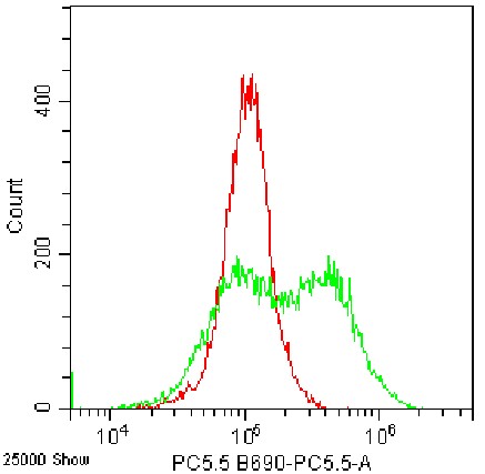 • Staining of fixed/permeabilized HEK-293F cell line cells transfected with pCMV-Il10(mouse)-3×FLAG-Neo plasmid (green) using PerCP-Cy5.5 Mouse IL-10 Antibody (Clone: JES5-16E3) (Catalog Number: G0785) and blank control (red). Analysis data derived from total cells.