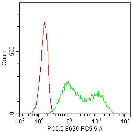 • Staining of fixed/permeabilized HEK-293F cells transfected with mouse LAG-3 plasmid using PerCP-Cy5.5 Mouse LAG-3 Antibody (Clone: C9B7W) (Product No.: G4325) (Green, Red: Blank Control). Analyzed data are derived from total cells.