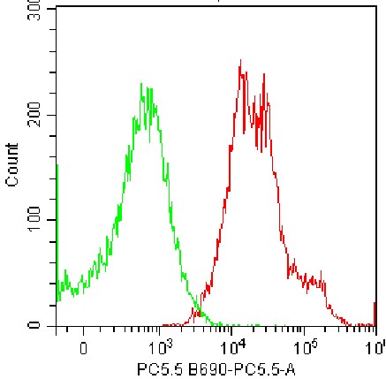 • Staining of splenic lymphocytes from C57BL/6 mice using PerCP-Cy5.5 Anti-Mouse LFA-1α/CD11a Antibody (Clone: M17/4) (Product No.: G4310) (red, green is blank control). Analyzed data are derived from live lymphocytes.