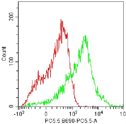 • Staining of C57BL/6 mouse ascites cells (green) using PerCP-Cy5.5 Mouse/rat CD81 Antibody (Clone: Eat-2) (Catalog Number: G2030) and blank control (red). Analysis data derived from live lymphocytes.