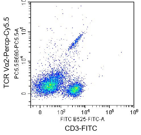 • Staining of C57BL/6 mouse splenic lymphocytes using FITC CD3 Antibody and PerCP-Cy5.5 Mouse TCR Vα2 Antibody (Clone: B20.1) (Catalog Number: G1670). Analysis data derived from live lymphocytes.