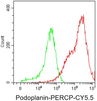 • Staining of TE-75 cell line cells using PerCP-Cy5.5 Anti-Podoplanin Antibody (Clone: L7B2) (Product No.: G1295) (red, green is blank control). Analyzed data are derived from live cells.