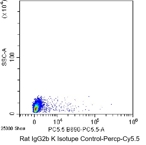 • Staining of C57BL/6 mouse splenic lymphocytes using PerCP-Cy5.5 Rat IgG2b κ Isotype Control Antibody (Clone: eB149/10H5) (Catalog Number: G0890). Analysis data derived from total cells.