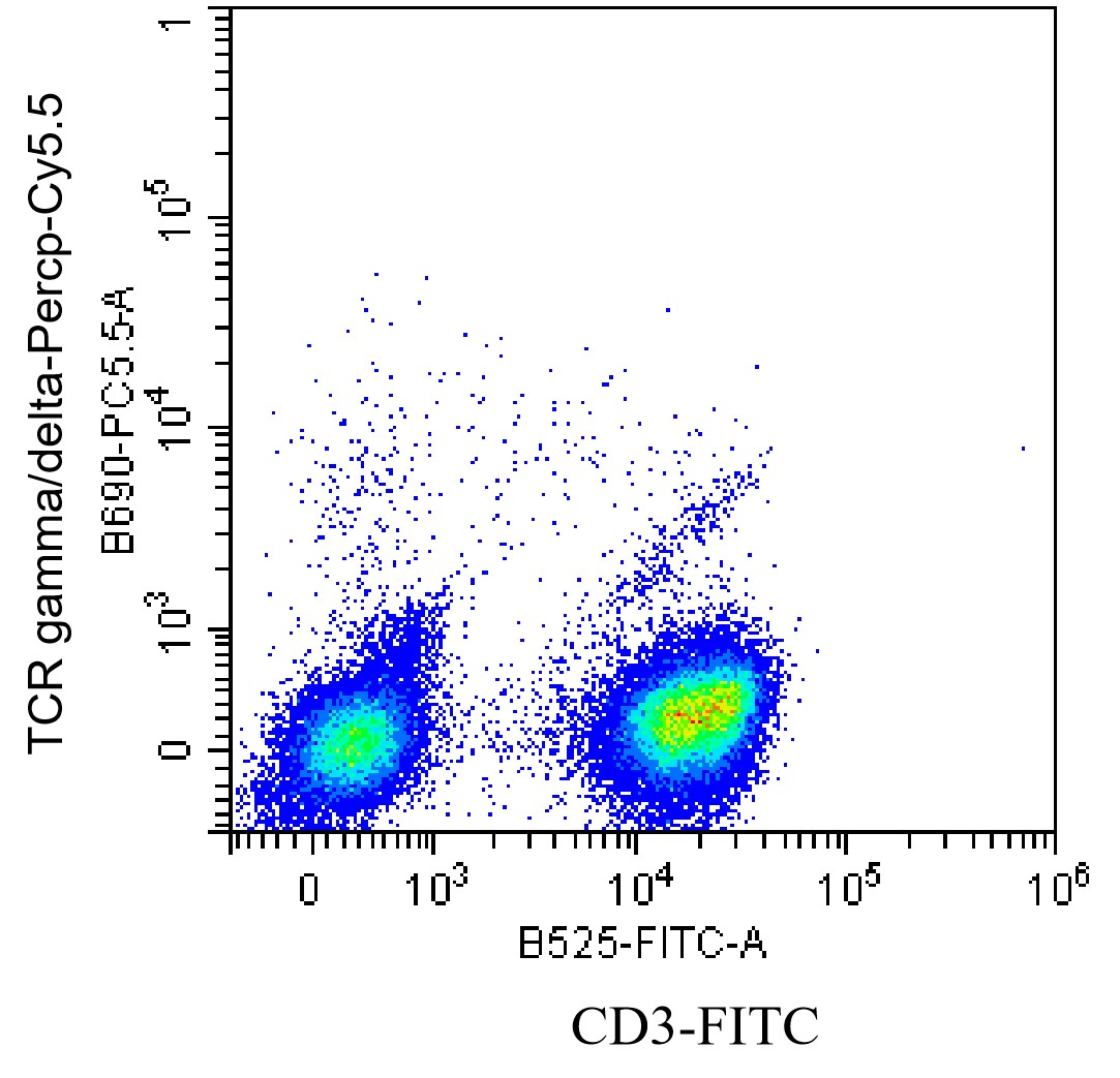 • Staining of lymph node cells from C57BL/6 mice using FITC CD3 Antibody and PerCP-Cy5.5 Anti-TCR gamma/delta Antibody (Clone: J18P6) (Product No.: G0920). Analyzed data are derived from live lymphocytes.