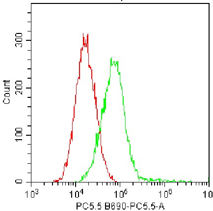 • Staining of J774A.1 cell line cells using PerCP F4/80 Antibody (Clone: BM8) (Product No.: G0071) (Green, Red: Blank Control). Analyzed data are derived from total live cells.