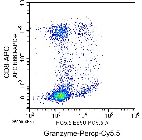 • Surface staining of normal human peripheral blood mononuclear cells (PBMCs) using APC Anti-CD8a Antibody, washed, then fixed/permeabilized, followed by intracellular staining using Percp Anti-Granzyme B Antibody (Clone: GB11) (Product No.: H0401). Analyzed data are derived from cells gated on lymphocytes.