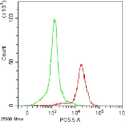 • Staining of Jurkat cell line cells using Percp Anti-Human CD107a Antibody (Clone: H4A3) (Product No.: H0461) (Red, Green: Blank Control). Analyzed data are derived from live cells.